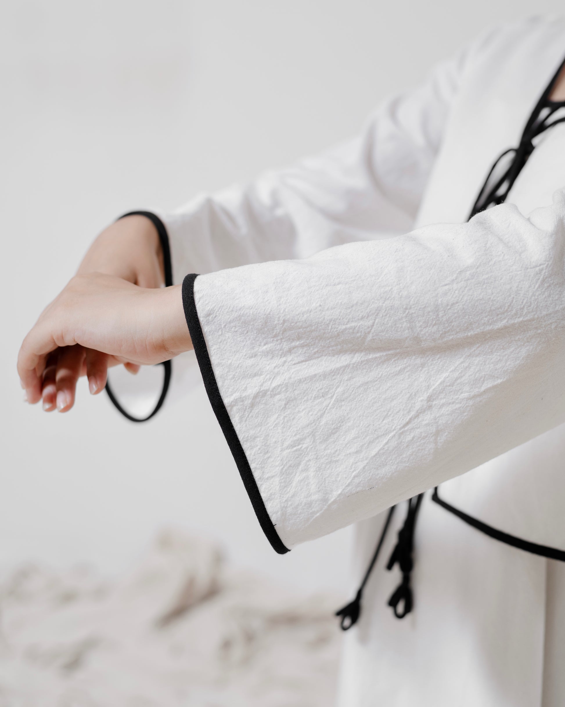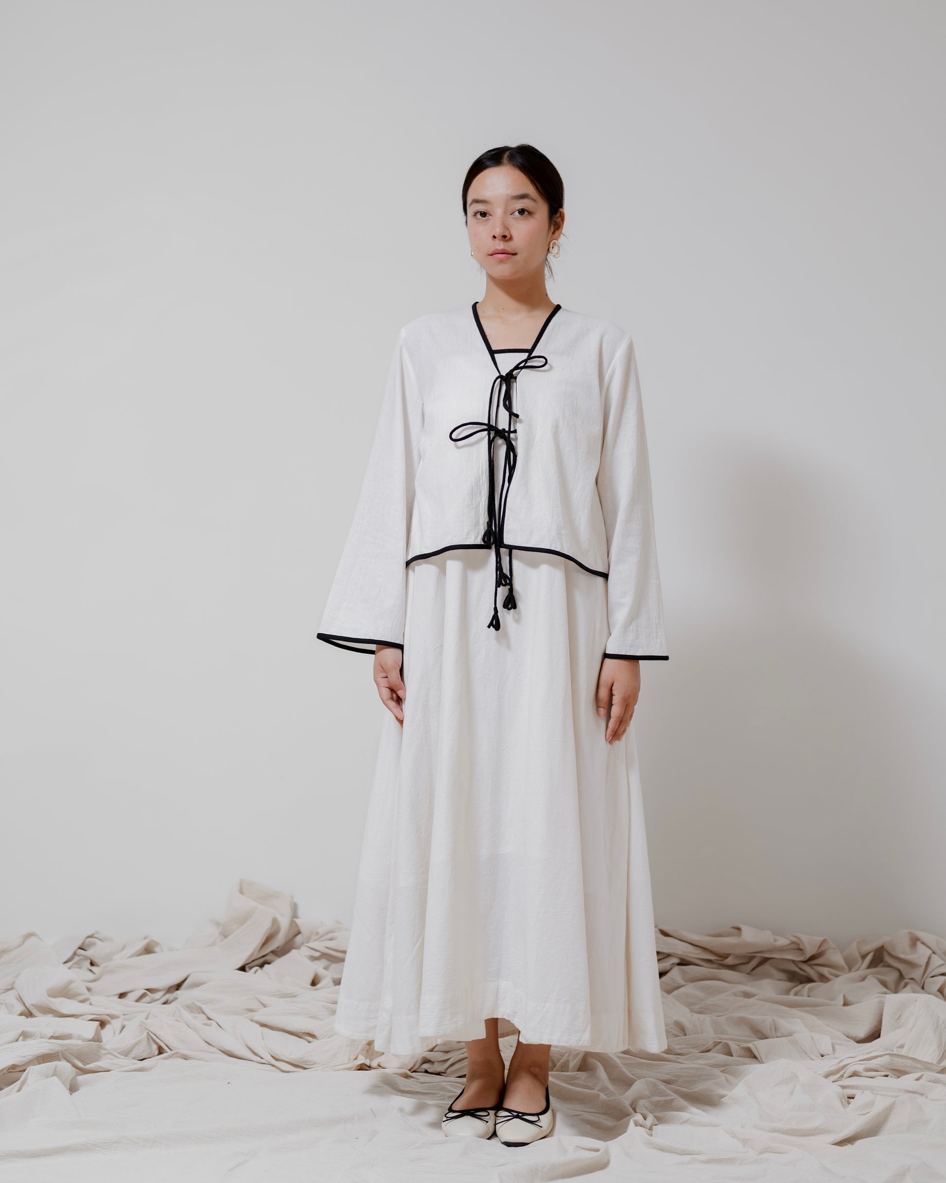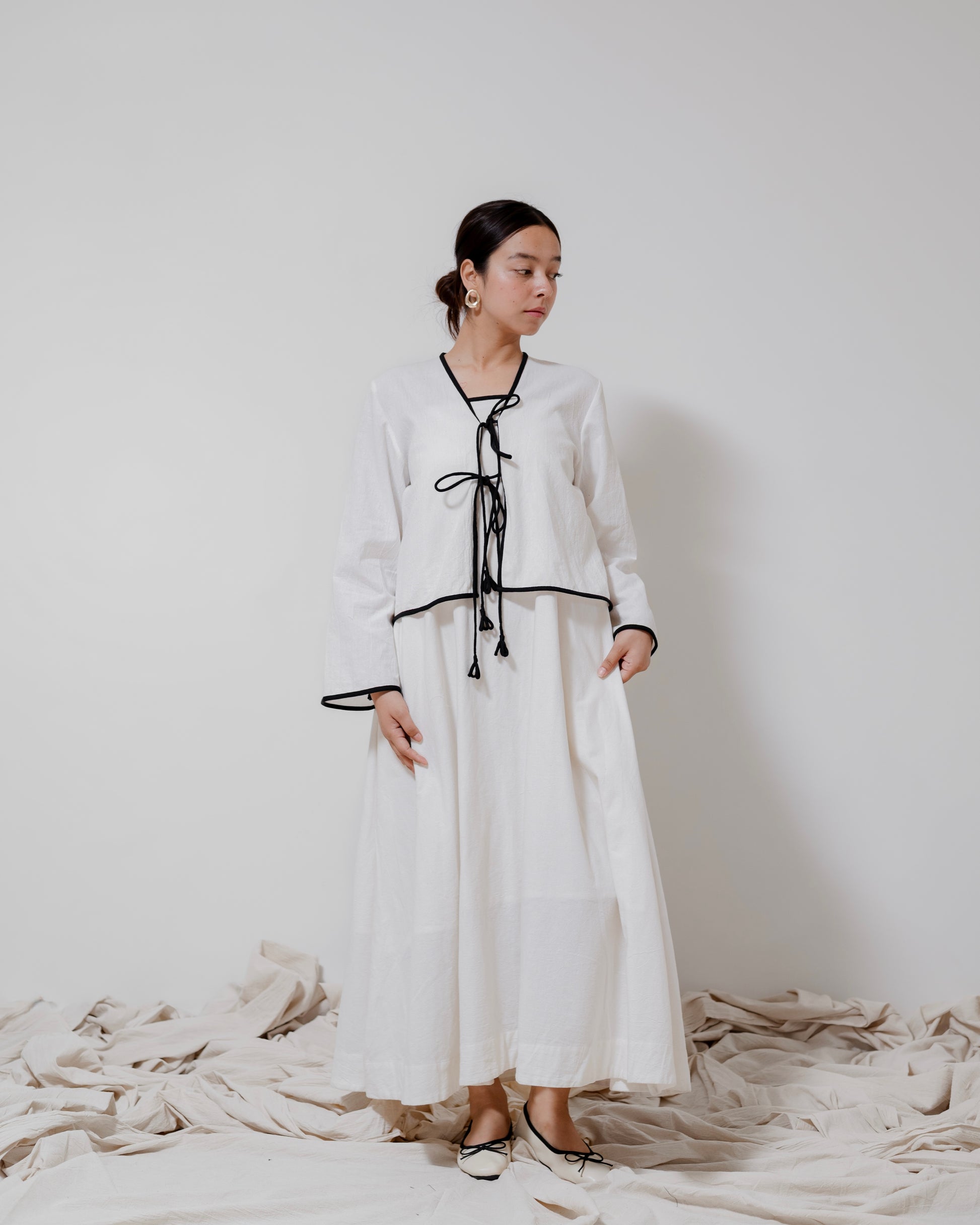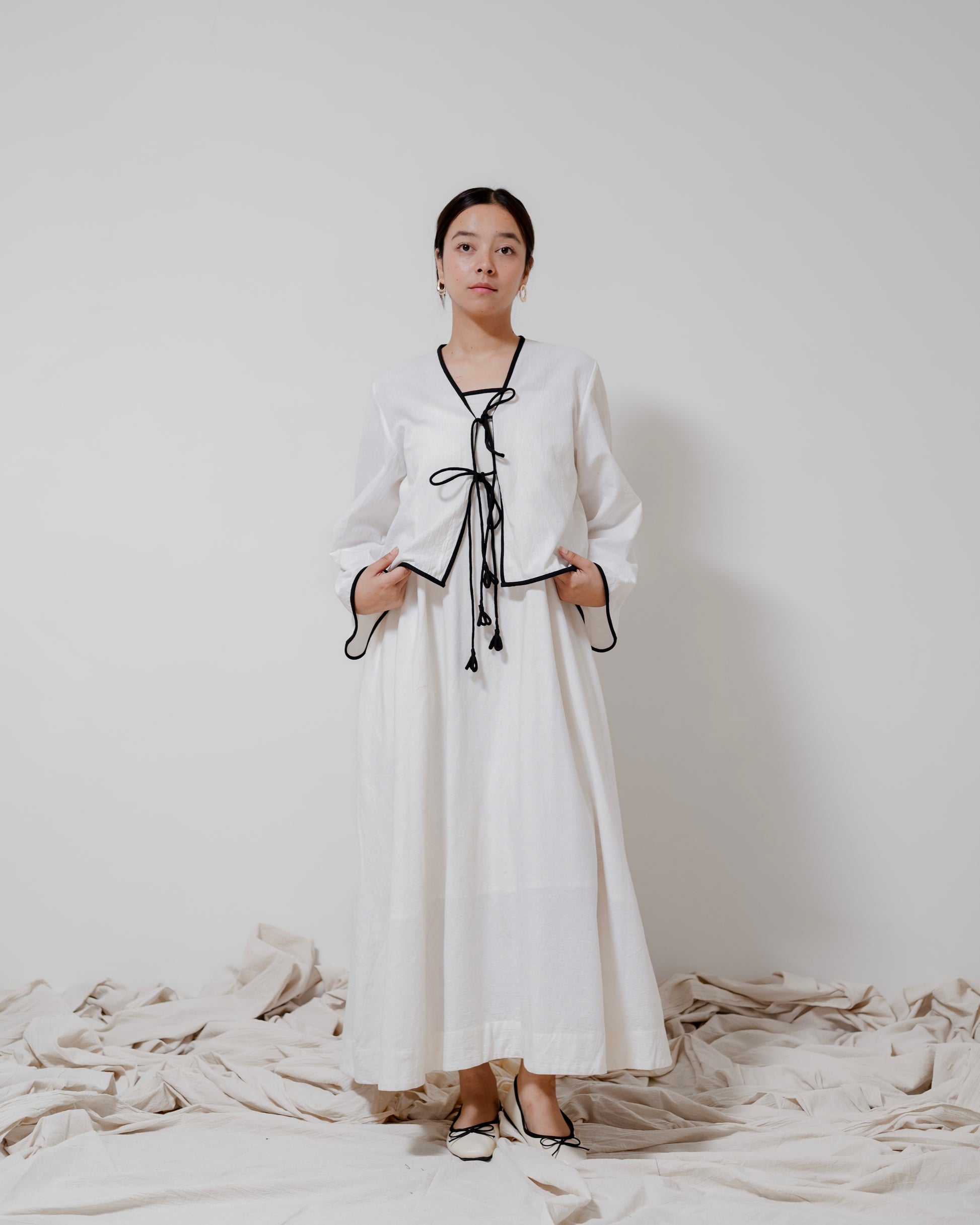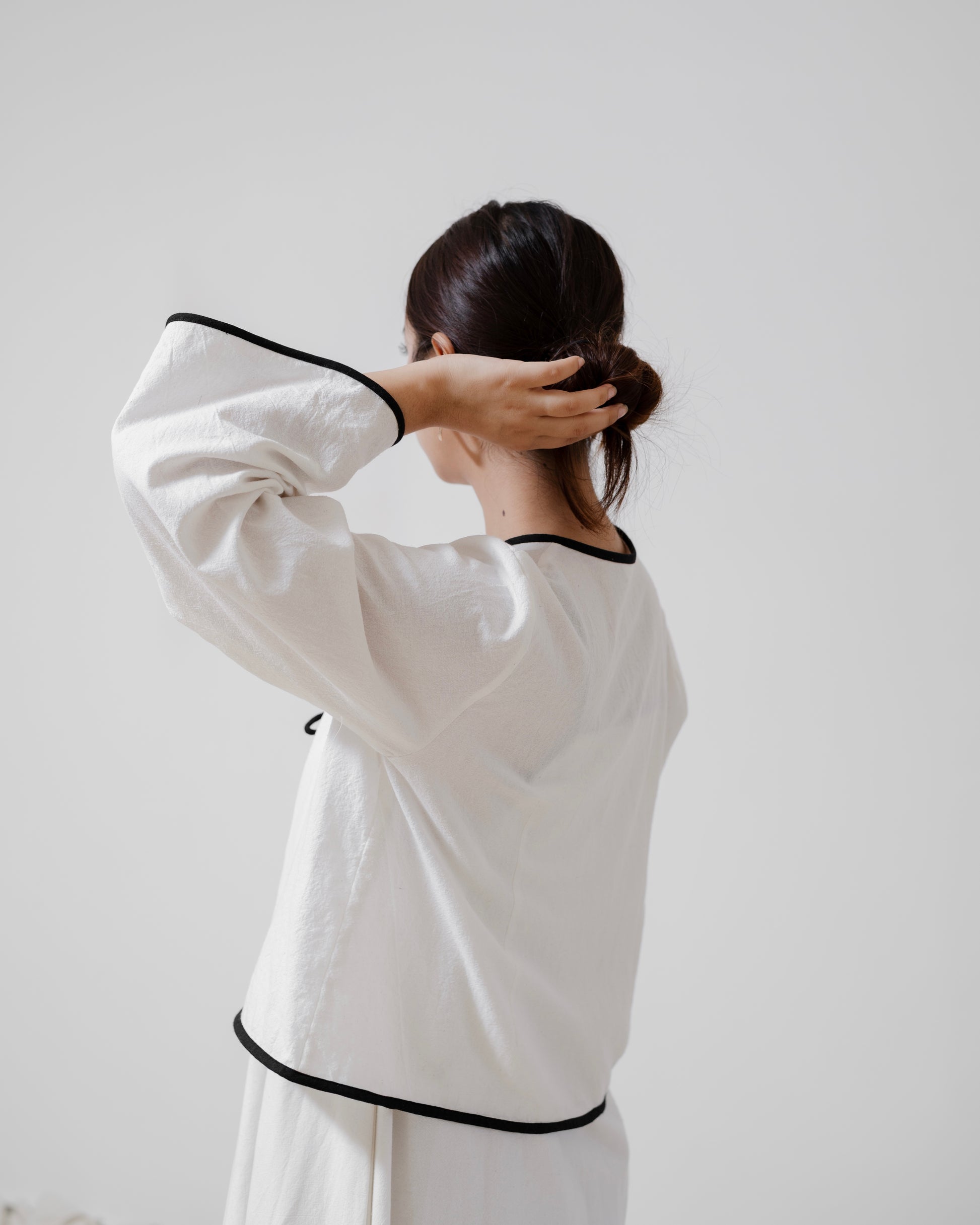 The ‘Awena’ top is crafted from handwoven Kala cotton and detailed with contrasting black panels and front ties finished in a delicate three-clover leaf pattern. Cut in a soft A-line silhouette — mirrored in its sleeves — 'Awena' combines structure with gentle flow, making it a refined yet playful addition to your wardrobe.