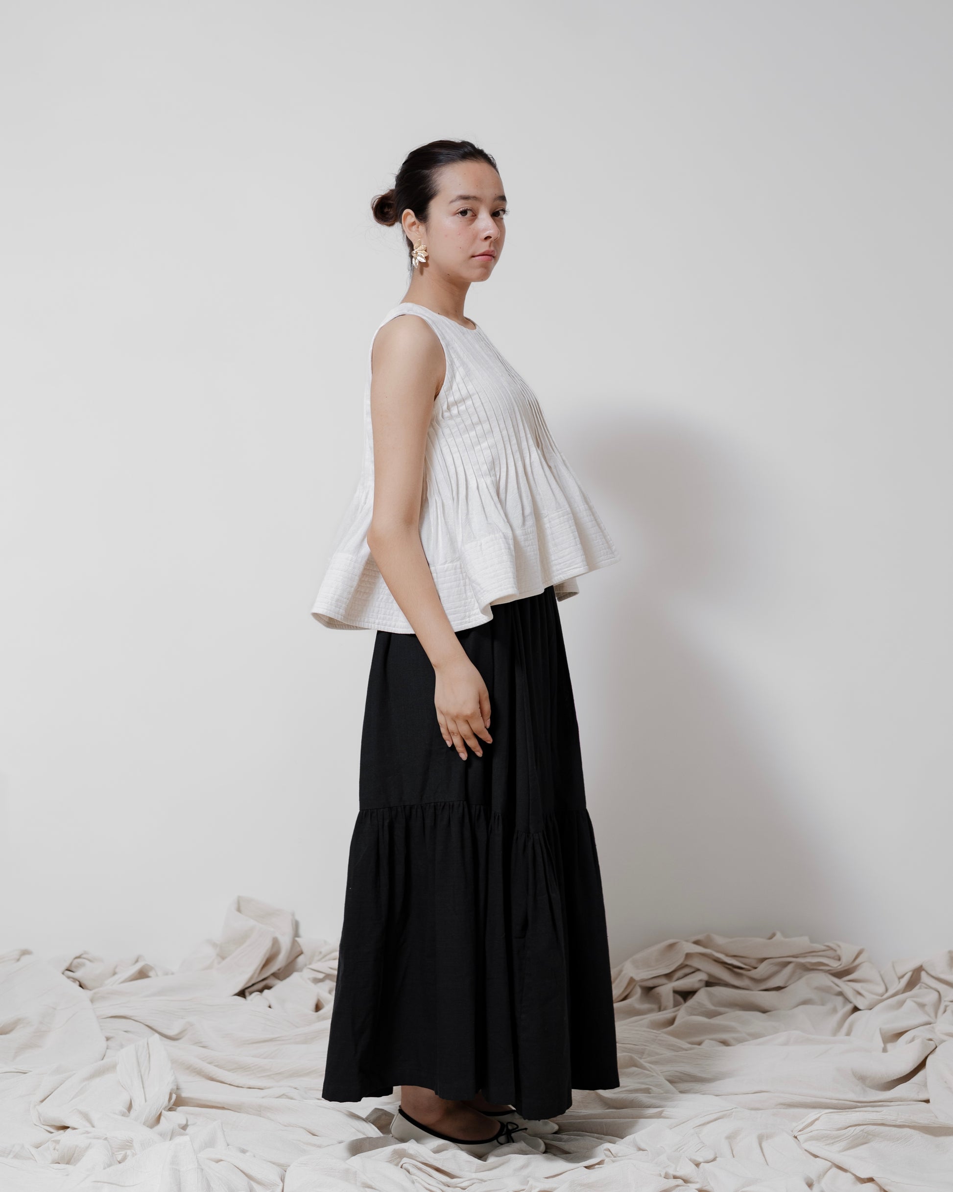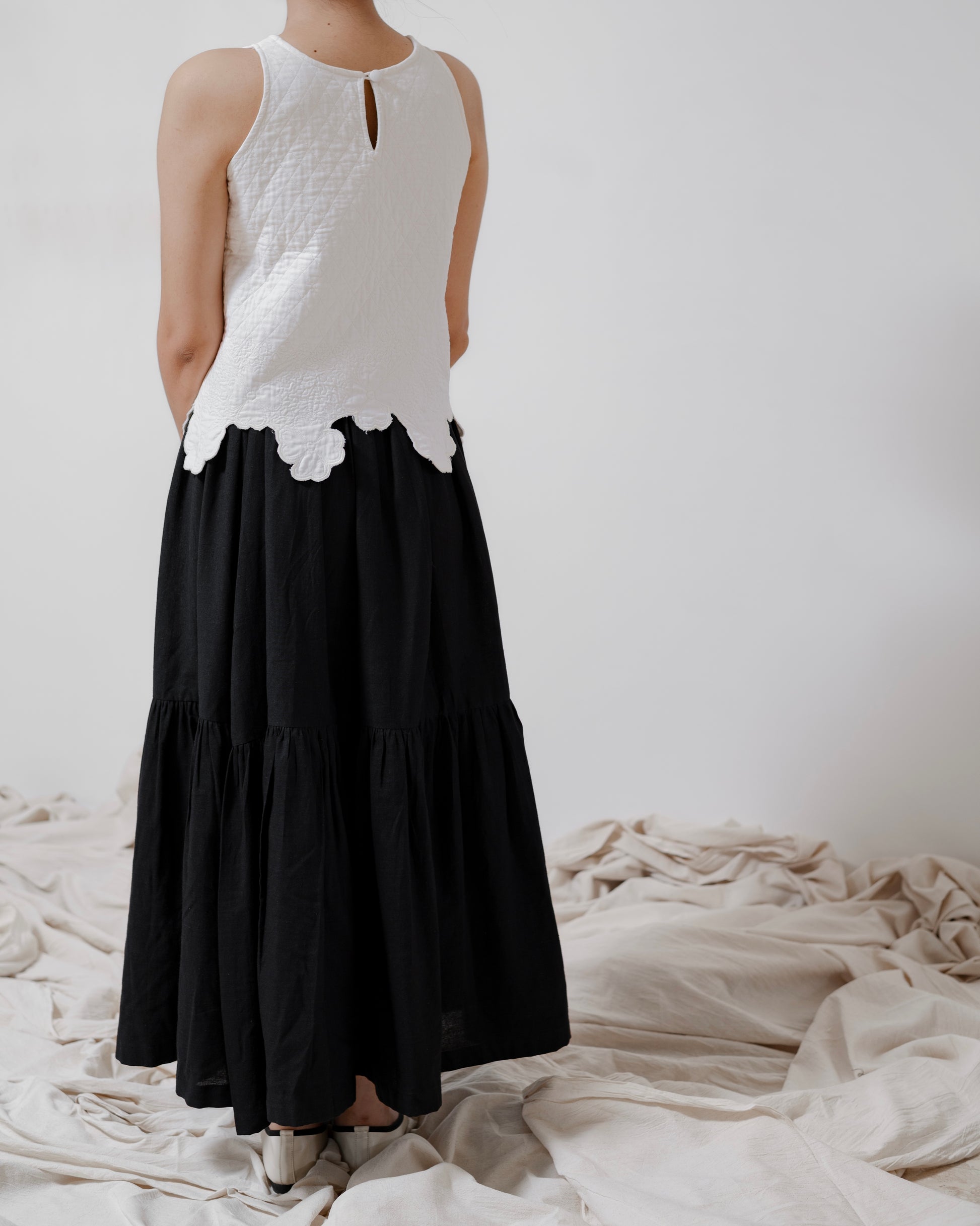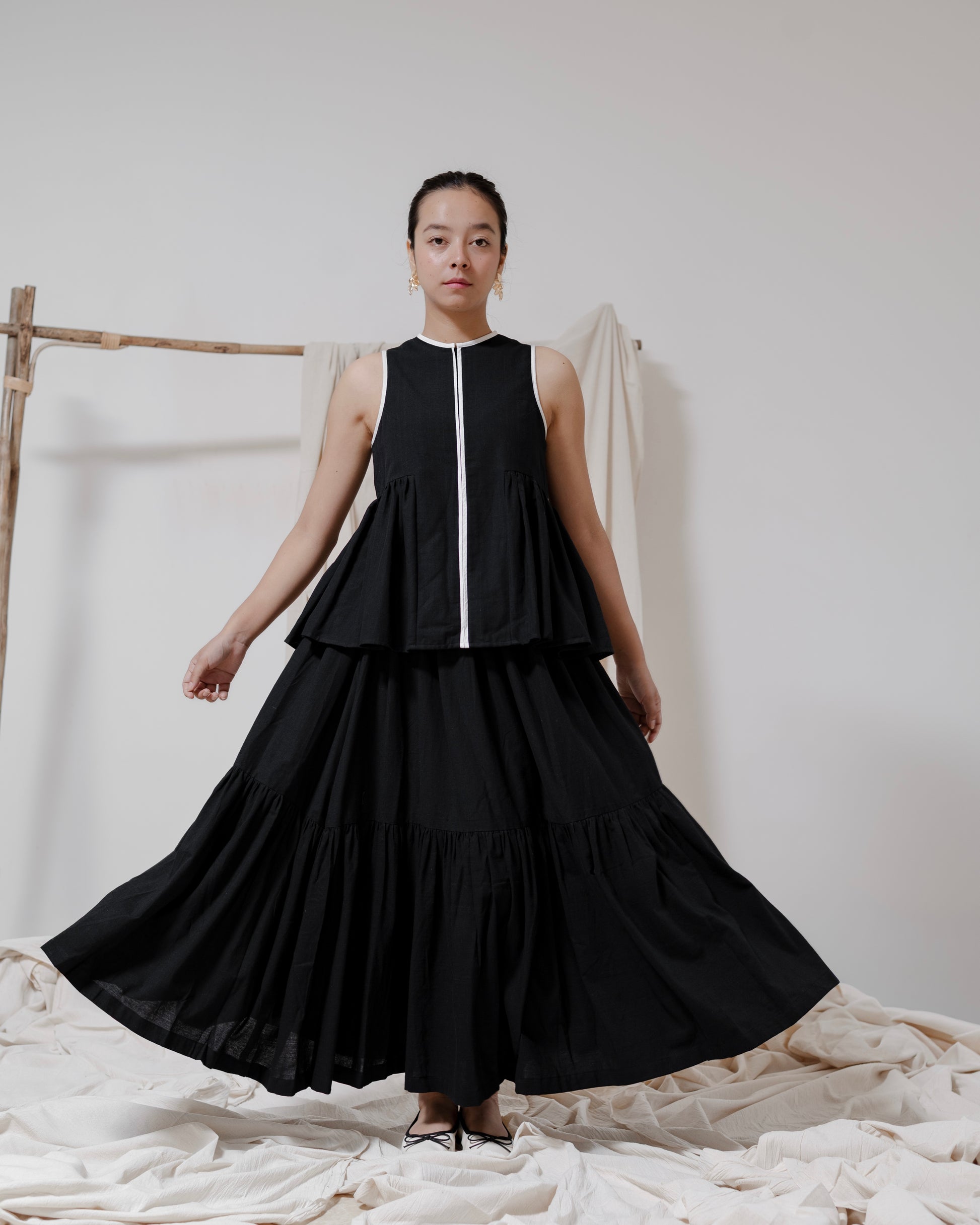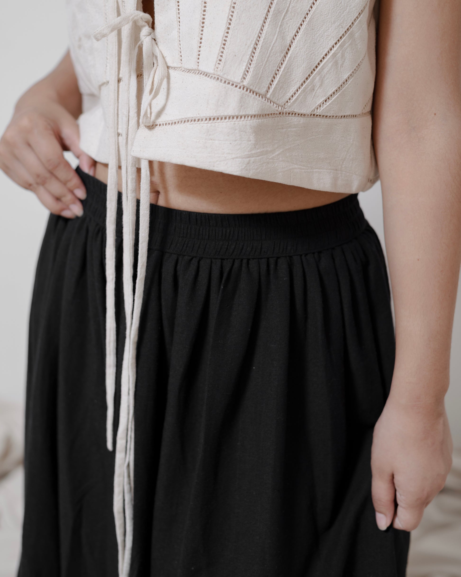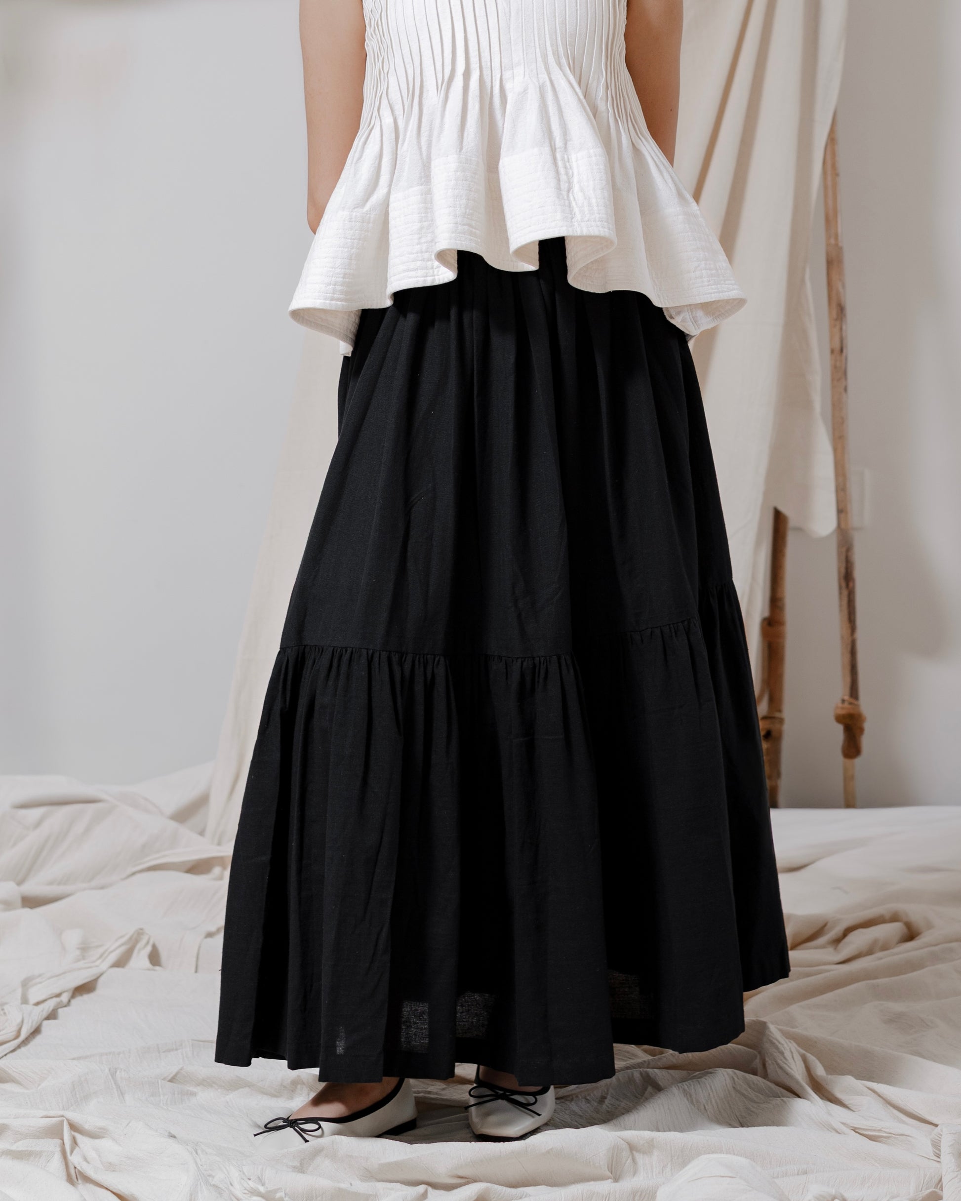 - The ‘Chance’ skirt is a tiered silhouette crafted from handspun, handwoven cotton. Designed with an elasticated waist for comfort and ease, it also features two pockets — a perfect blend of simplicity, movement, and everyday charm.