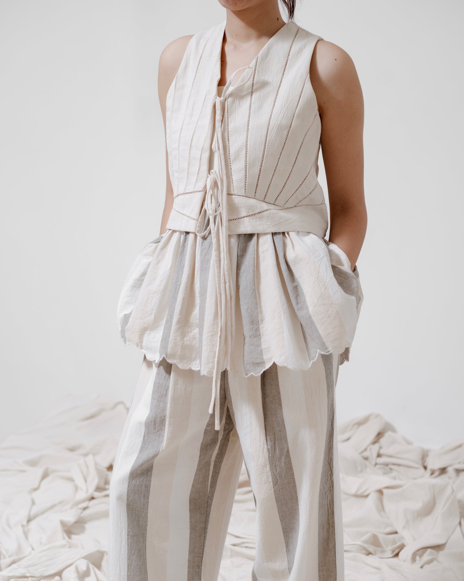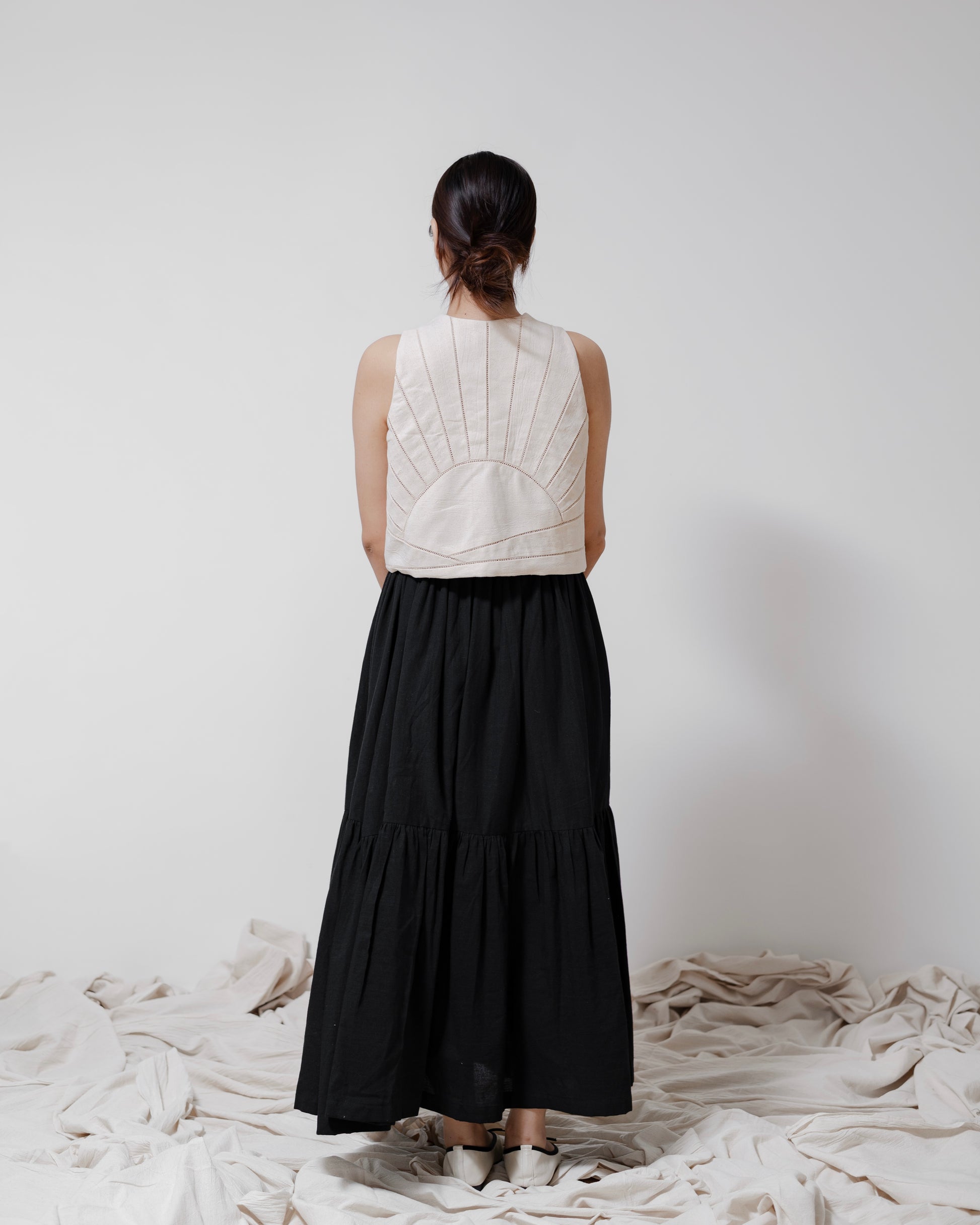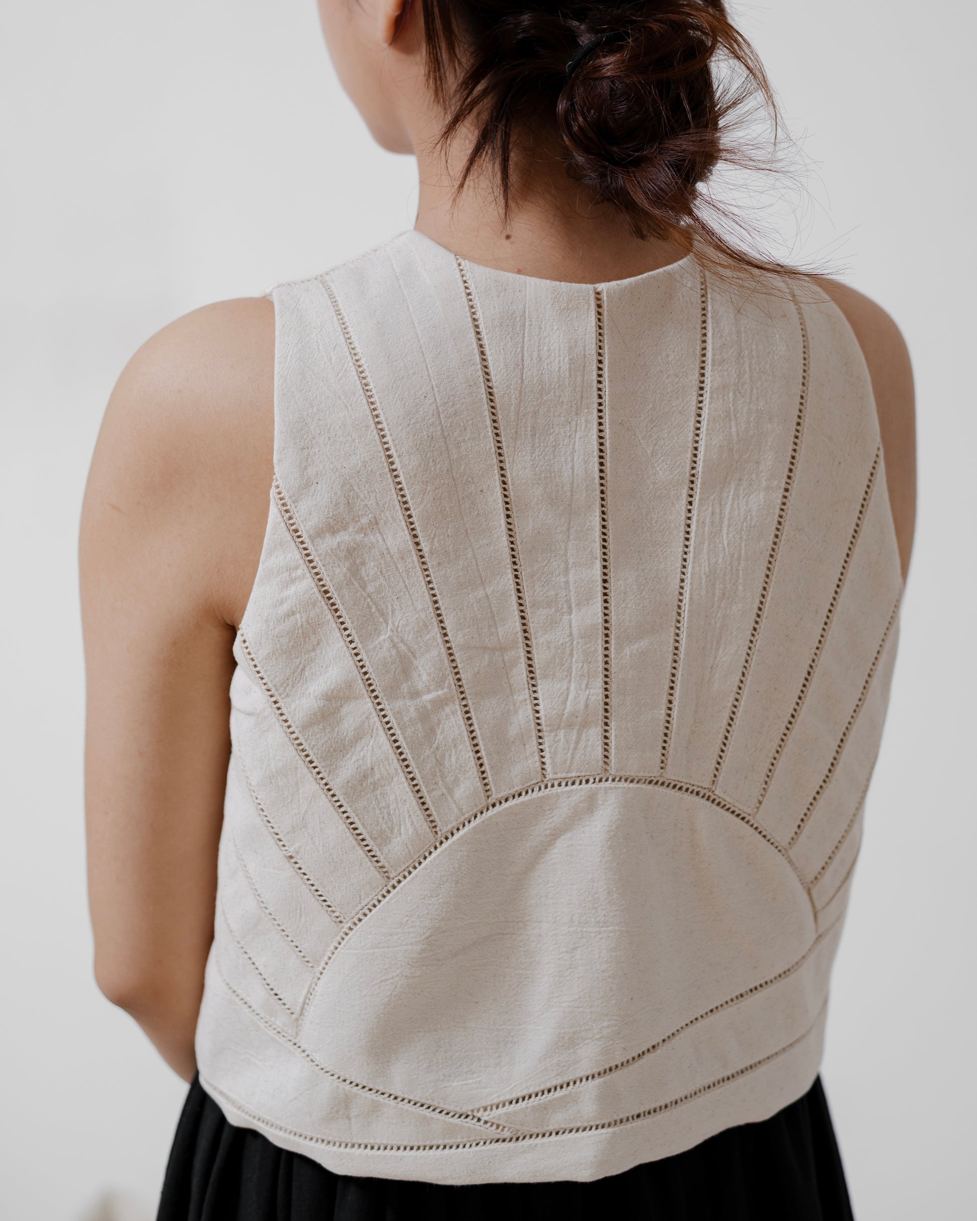 - The ‘Dayton’ top is a tie-up cropped piece crafted from Kala cotton and fully lined in the same fabric for a seamless finish. Featuring intricate lace detailing, the design forms a delicate sun with its rays and subtle mountains. Each panel is carefully cut and stitched to create this handcrafted artistry, making the Dayton a wearable piece of art.