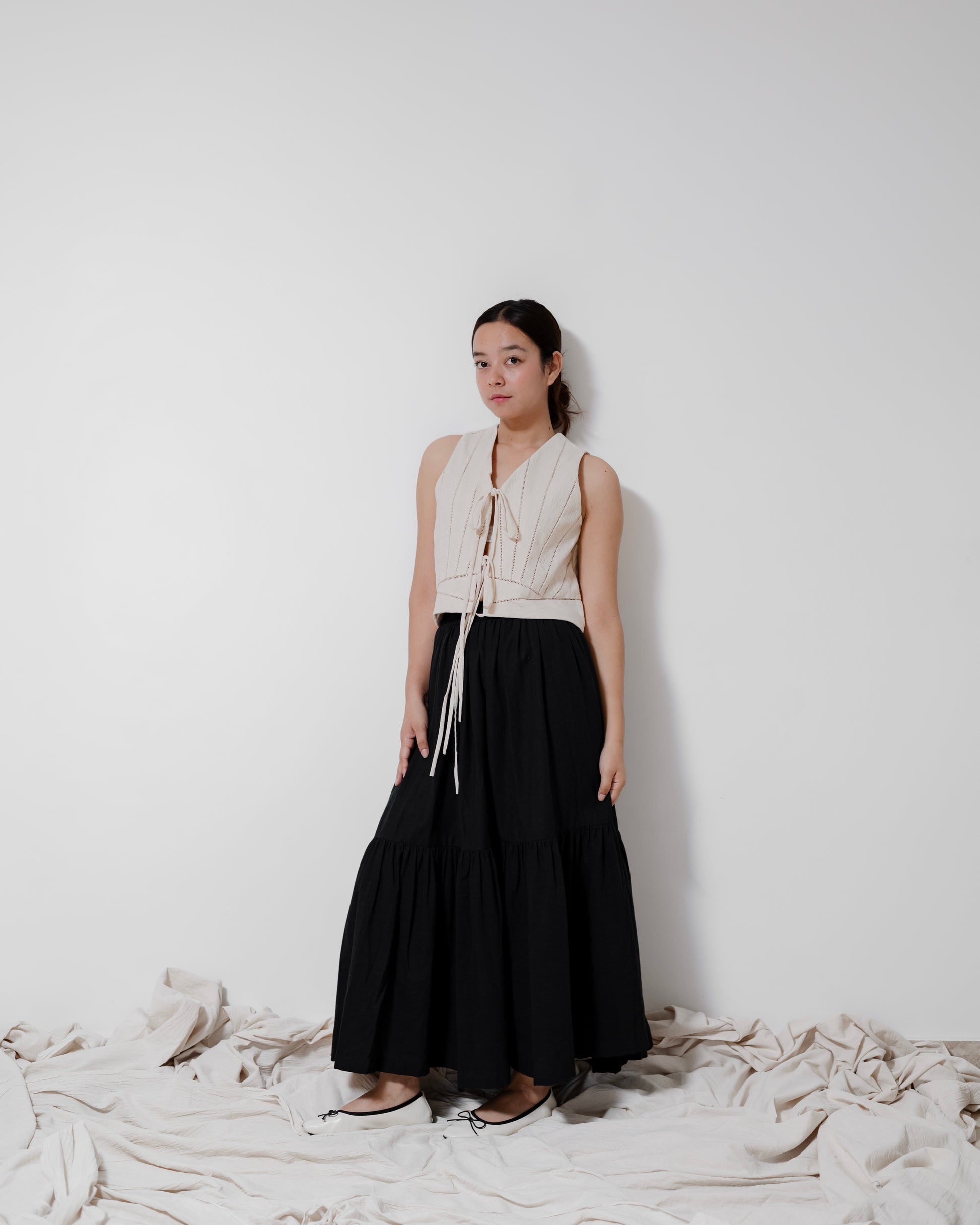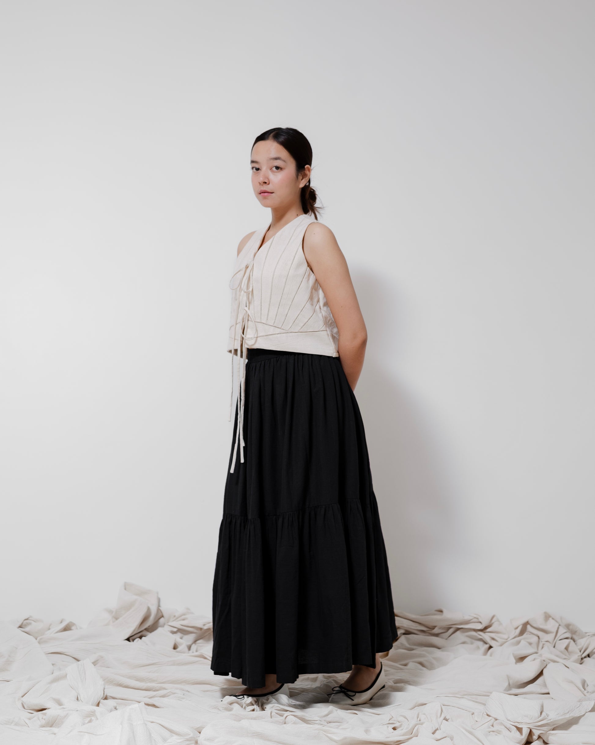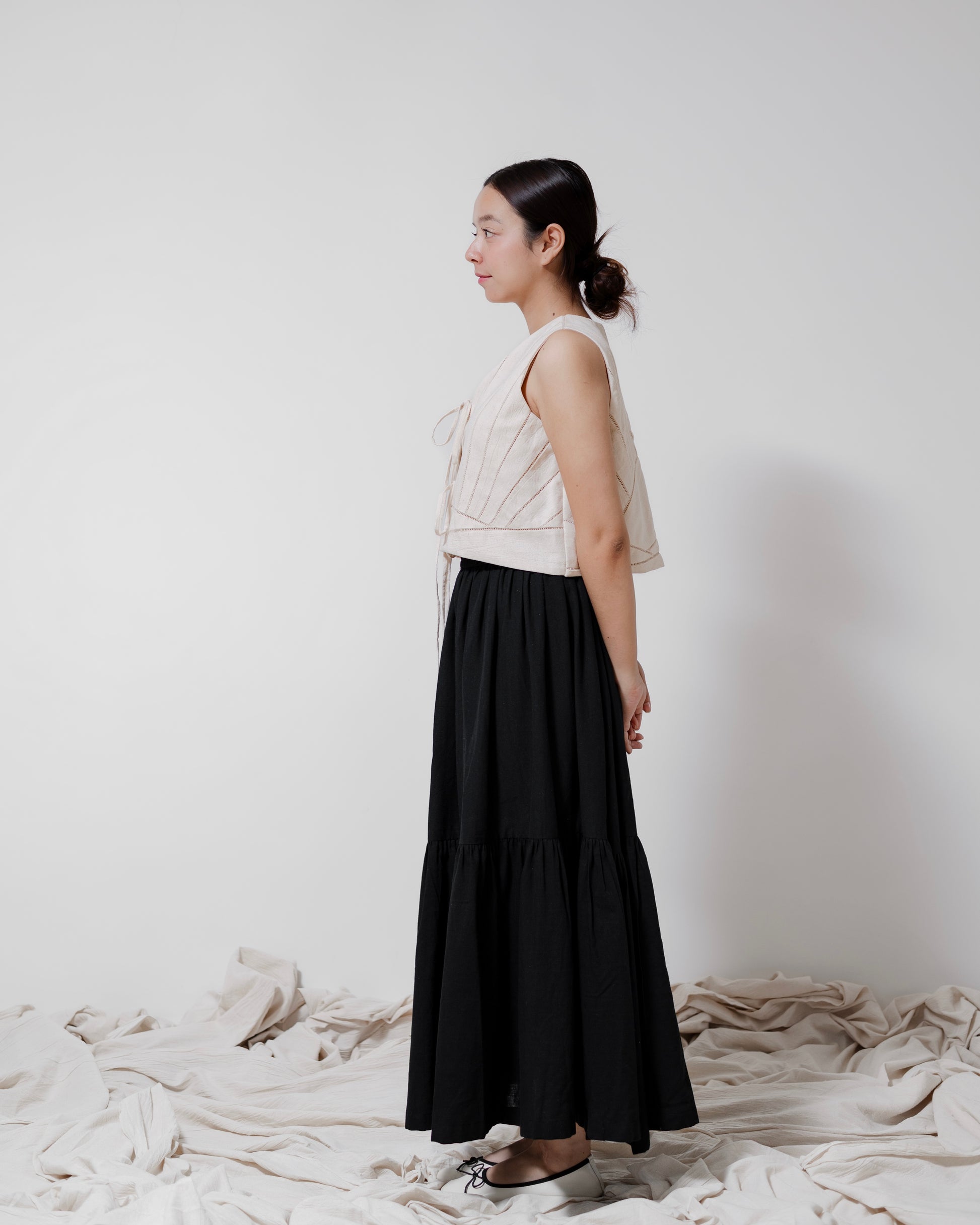 - The ‘Dayton’ top is a tie-up cropped piece crafted from Kala cotton and fully lined in the same fabric for a seamless finish. Featuring intricate lace detailing, the design forms a delicate sun with its rays and subtle mountains. Each panel is carefully cut and stitched to create this handcrafted artistry, making the Dayton a wearable piece of art.