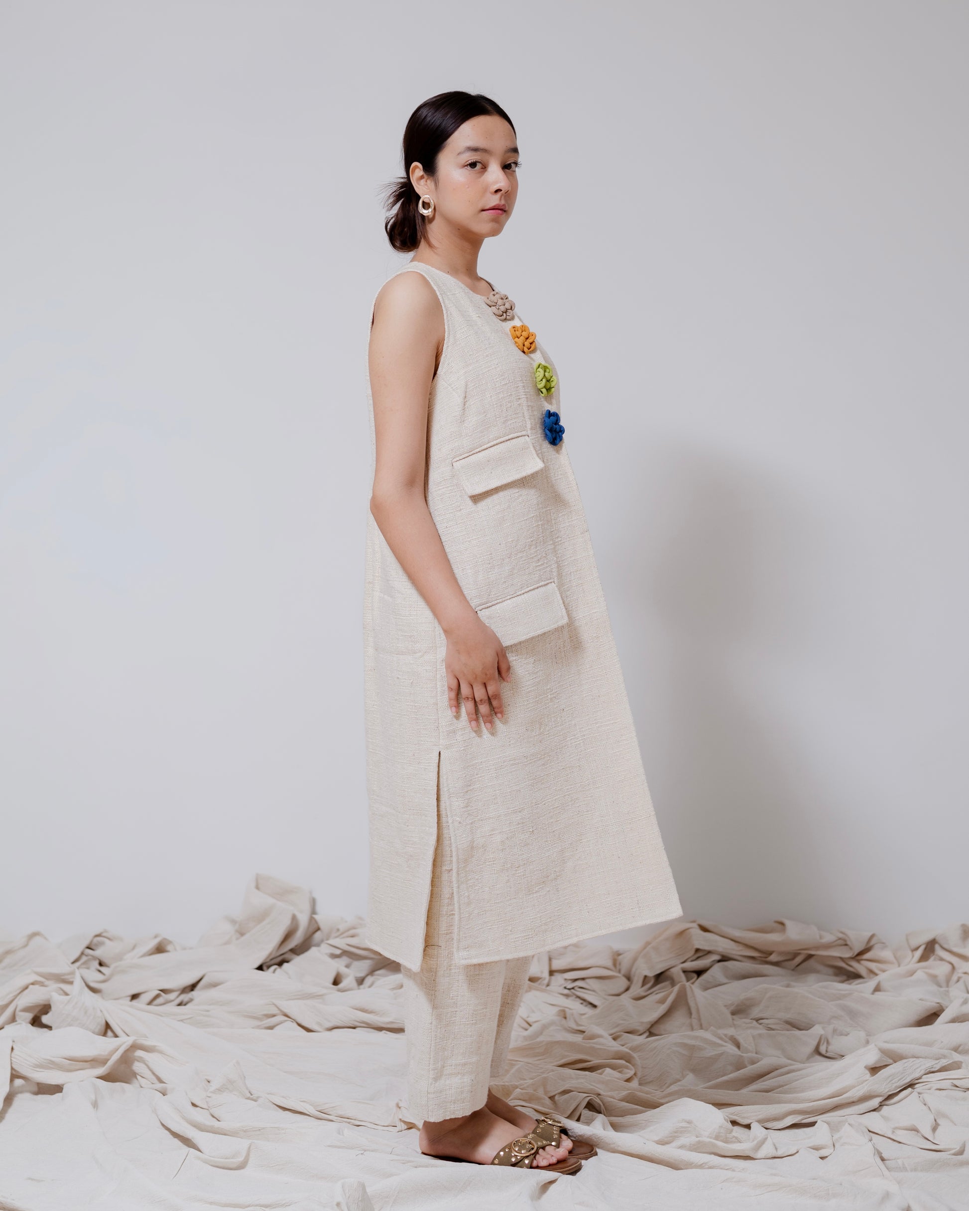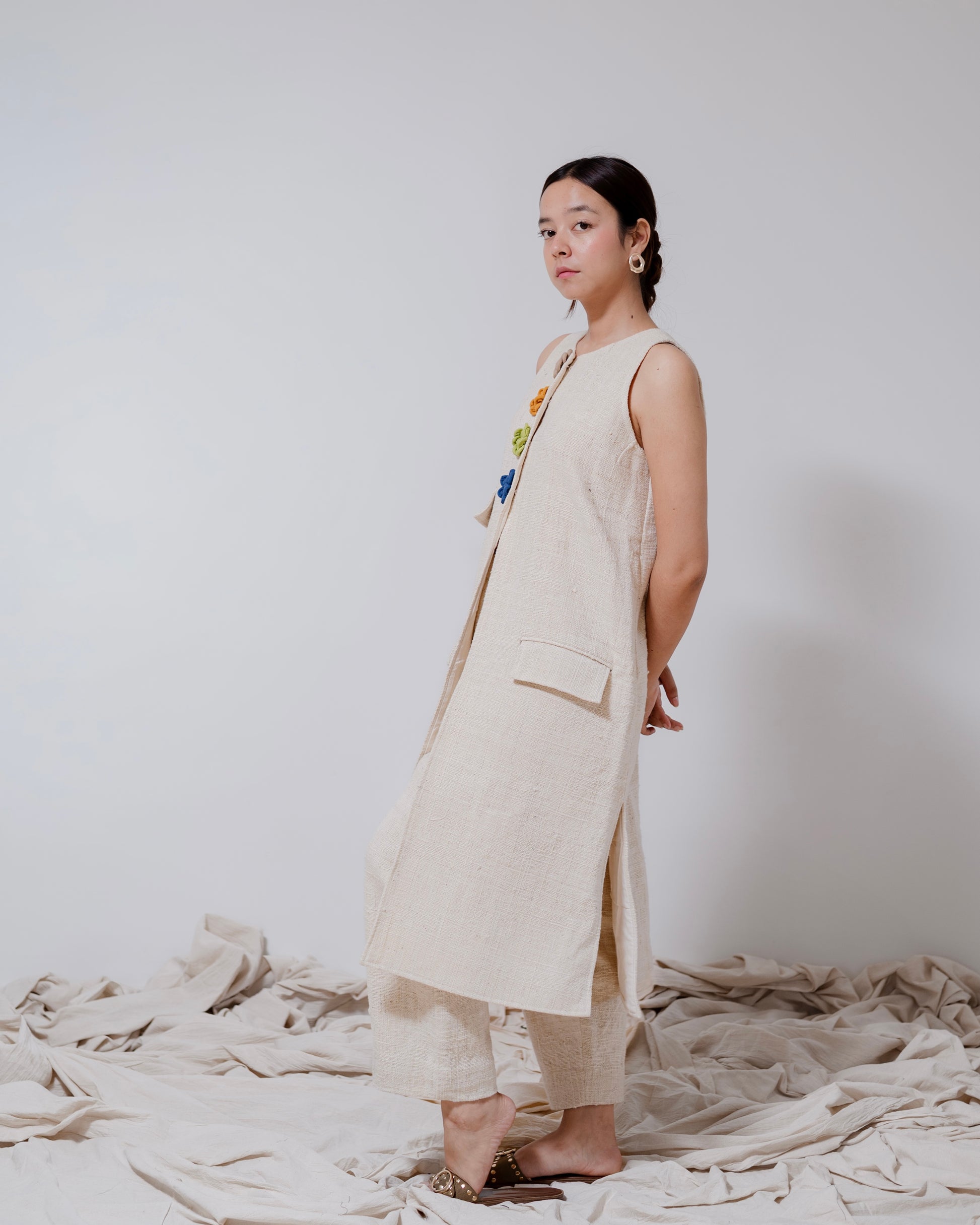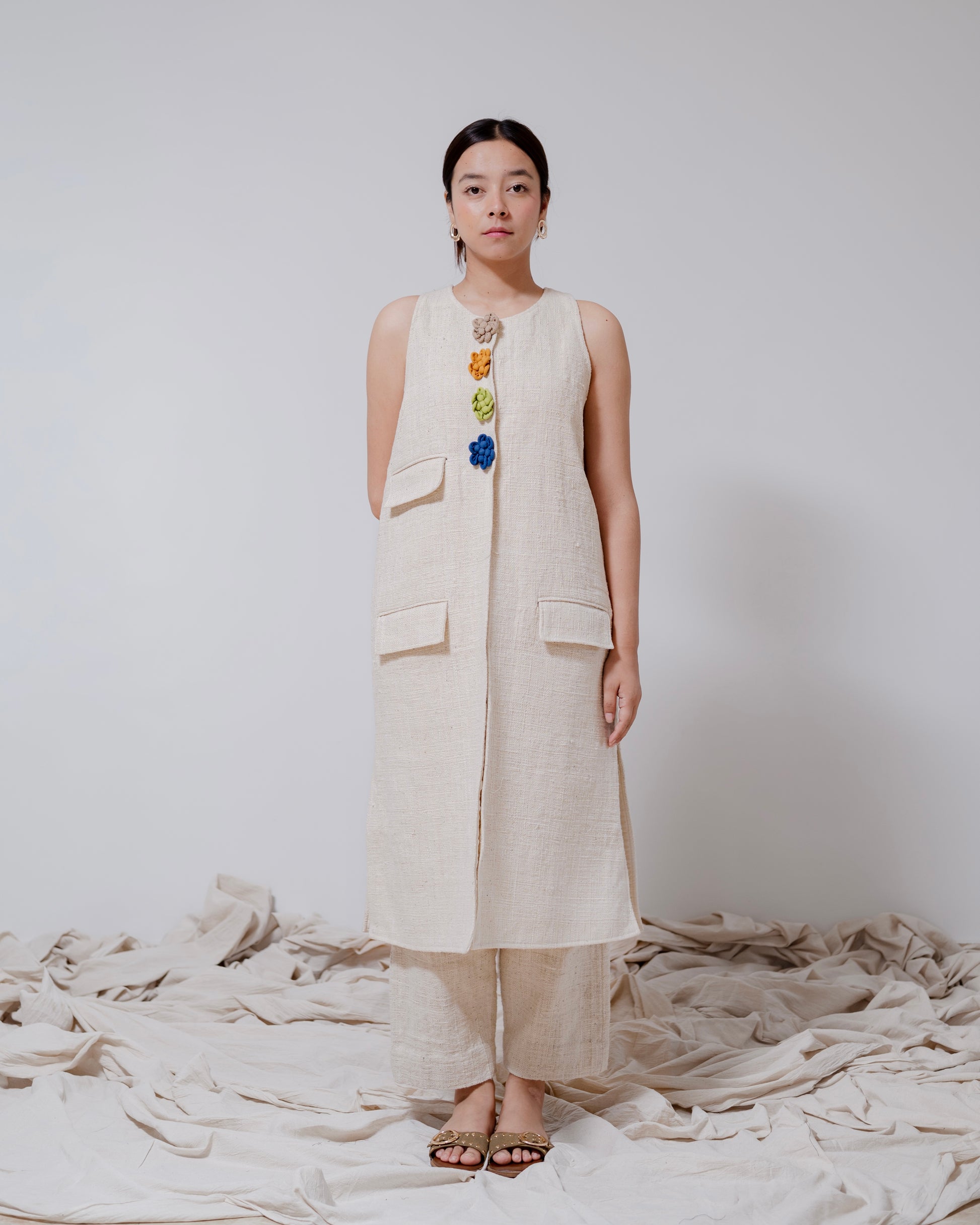 - The ‘Florence’ coat is a long, sleeveless silhouette crafted from 0-count khadi cotton and fully lined with Mal cotton. Designed with side slits for ease of movement, it’s stitched with utmost precision and adorned with handmade floral accents — delicate embellishments that add a touch of artistry. Wear it as is or layer it with ease.