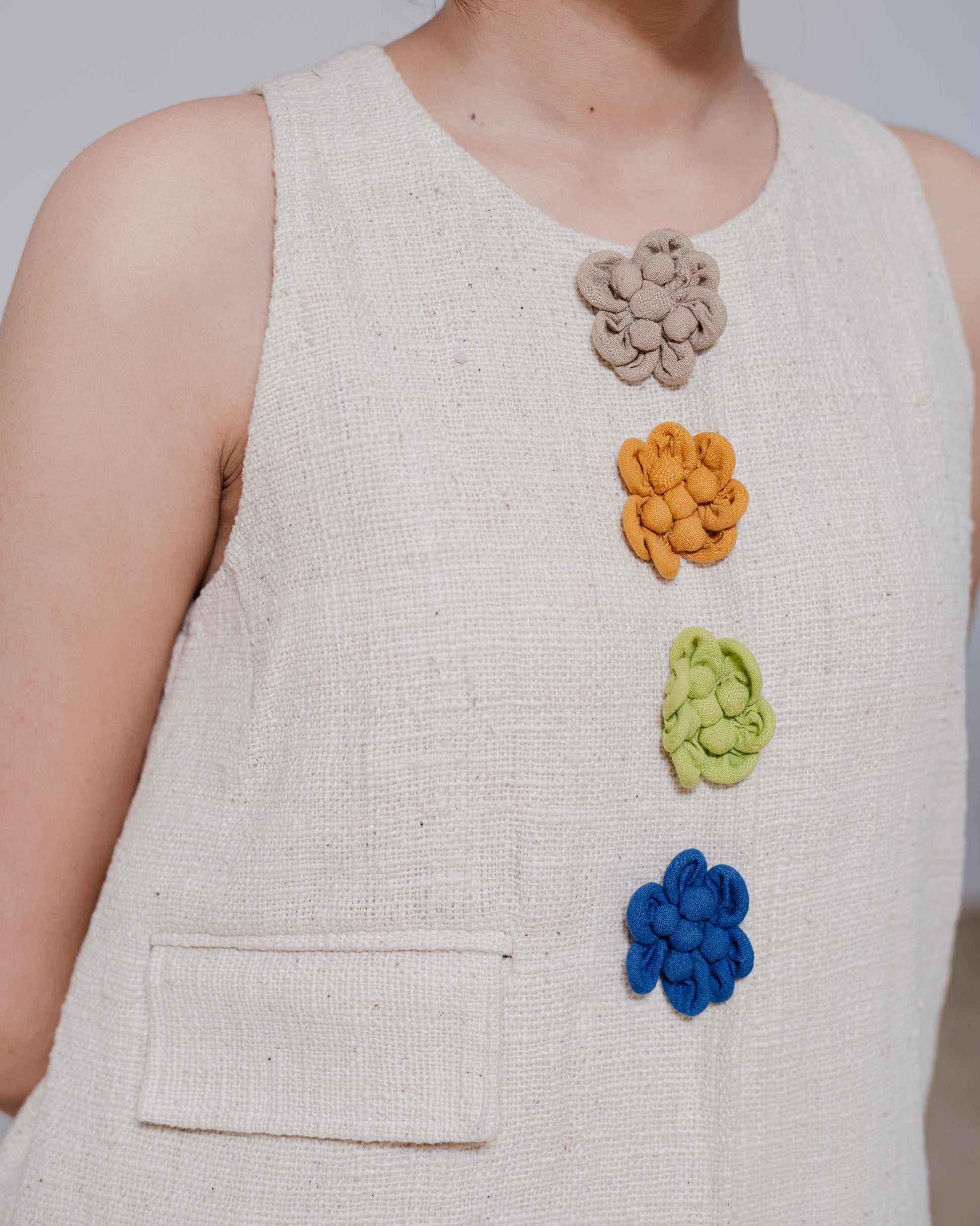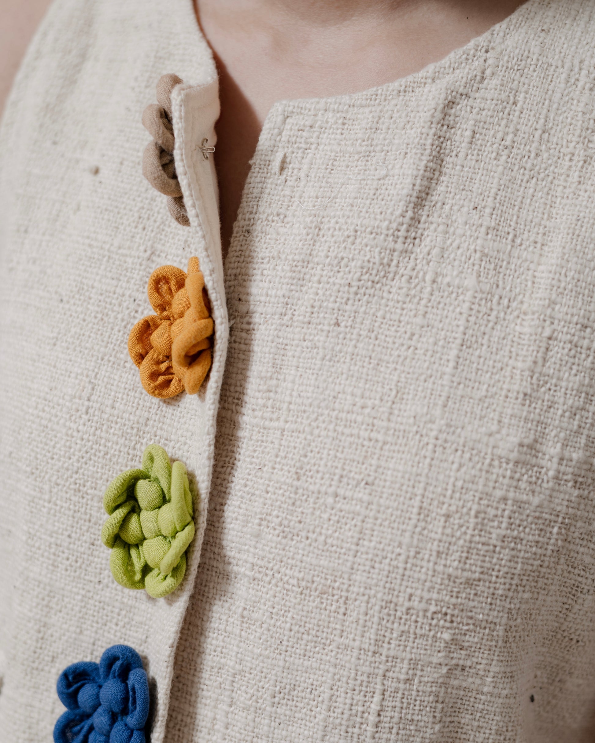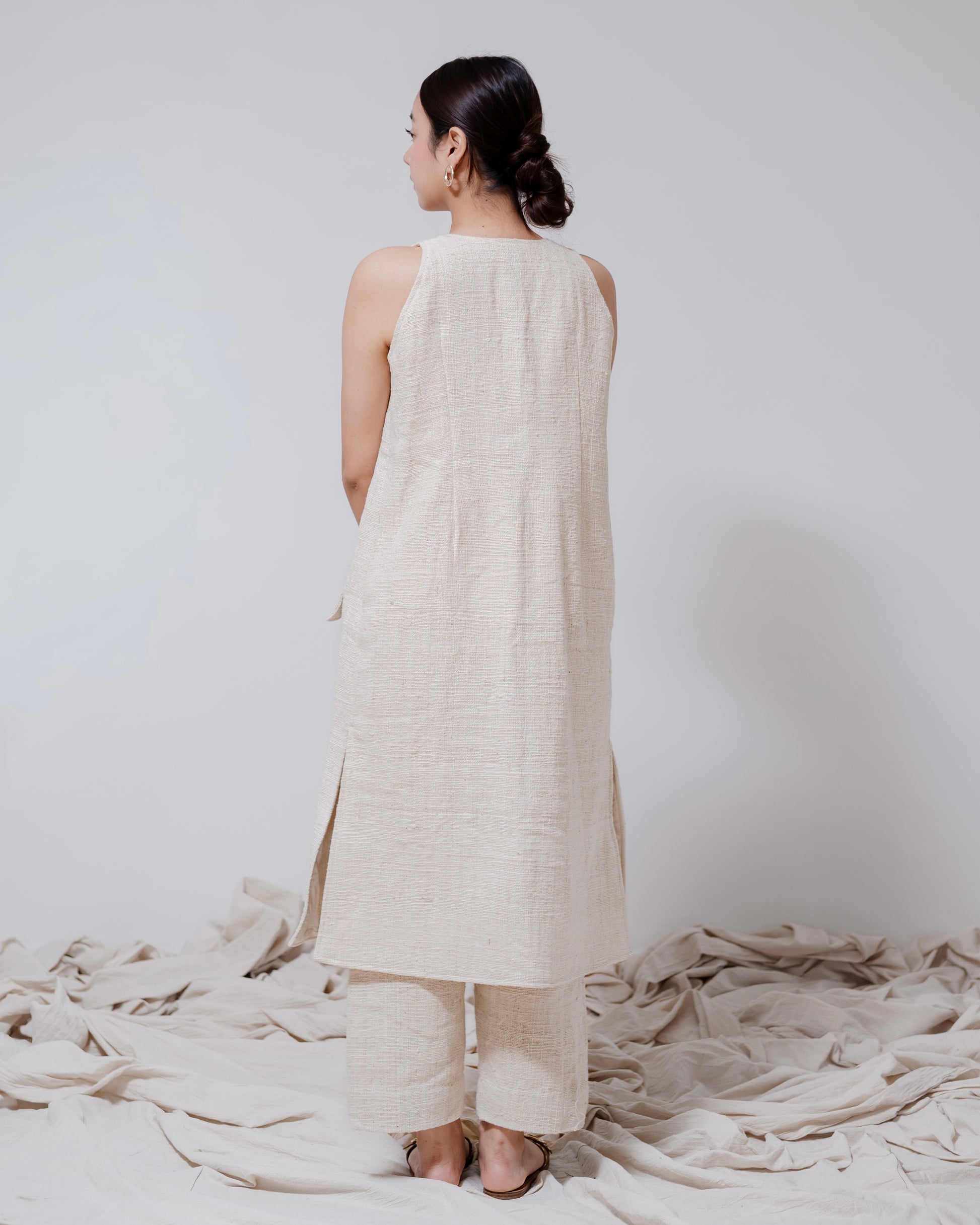 - The ‘Florence’ coat is a long, sleeveless silhouette crafted from 0-count khadi cotton and fully lined with Mal cotton. Designed with side slits for ease of movement, it’s stitched with utmost precision and adorned with handmade floral accents — delicate embellishments that add a touch of artistry. Wear it as is or layer it with ease.