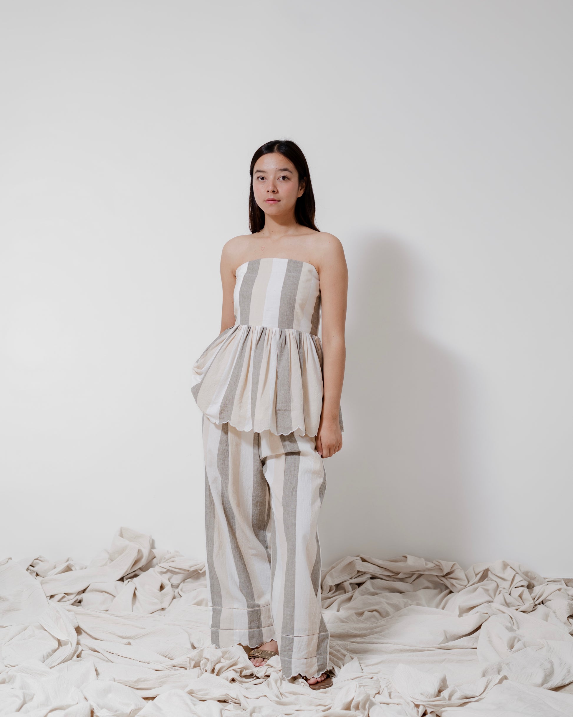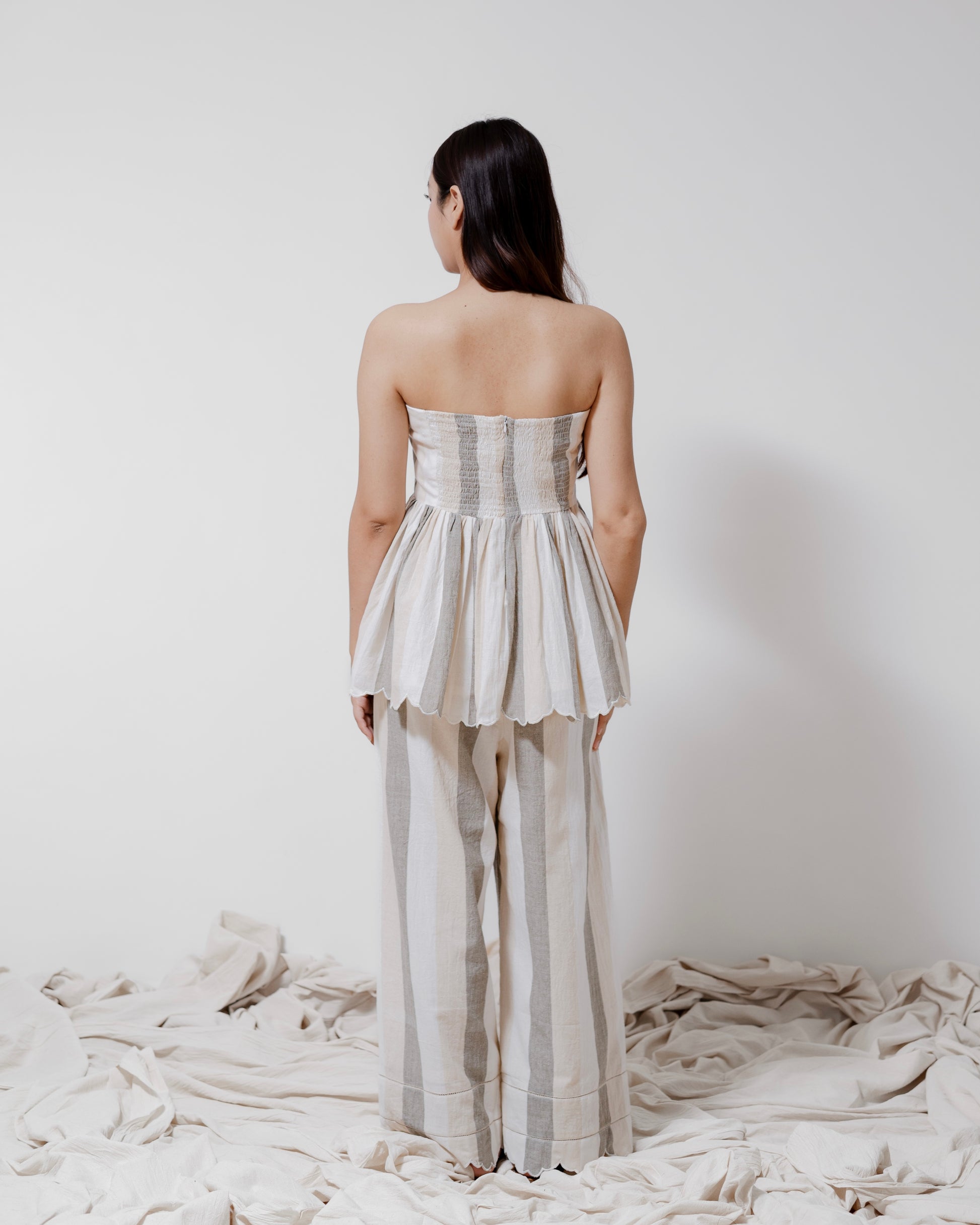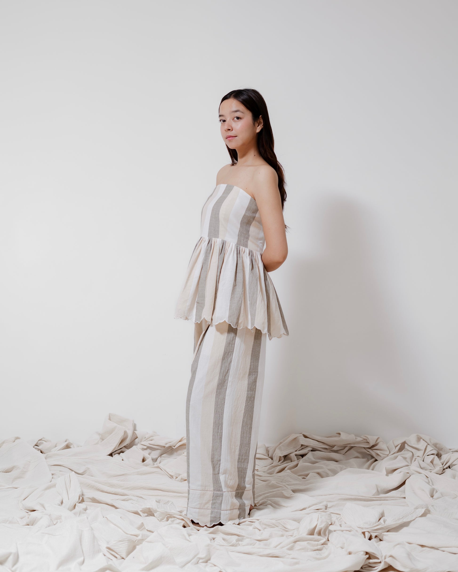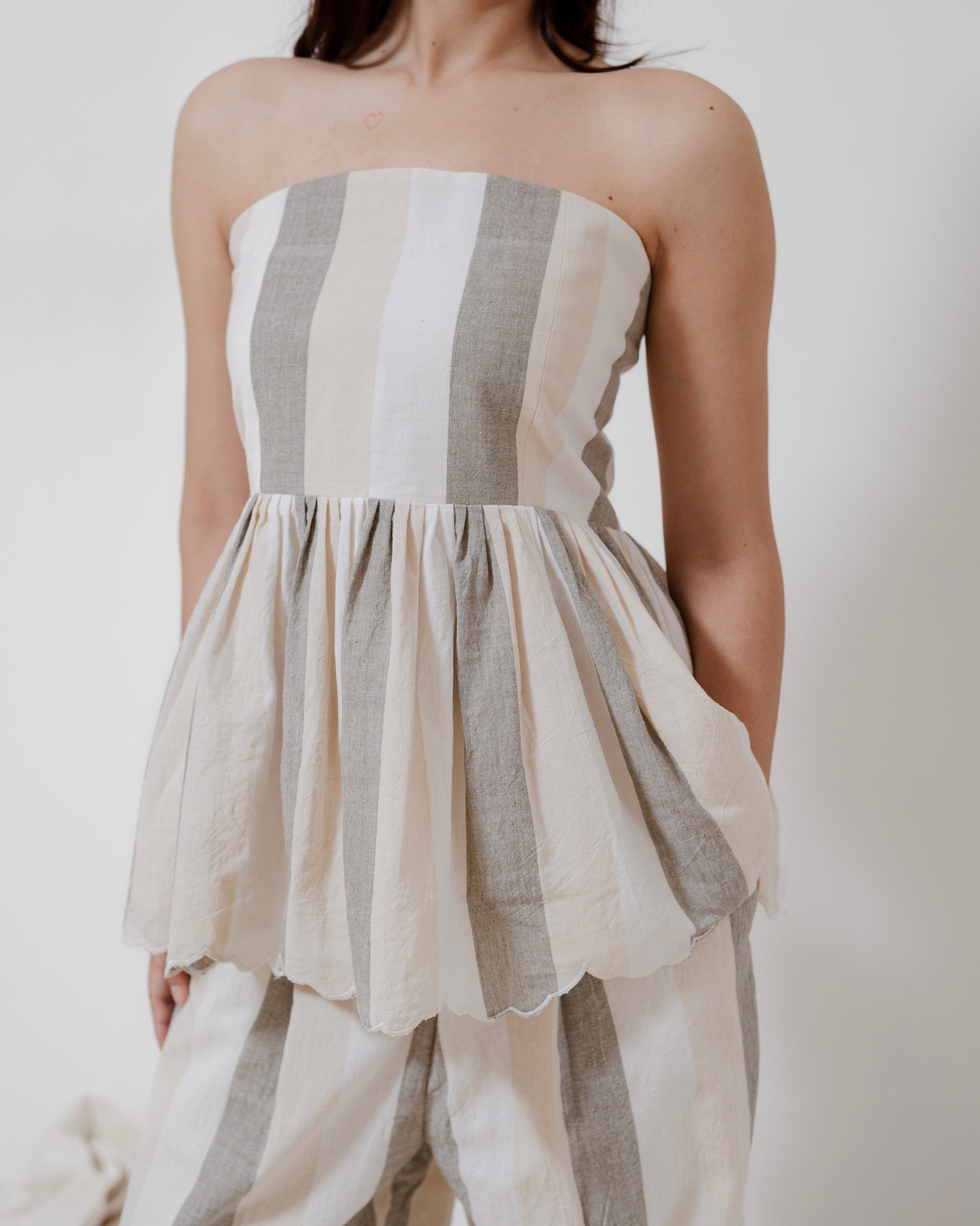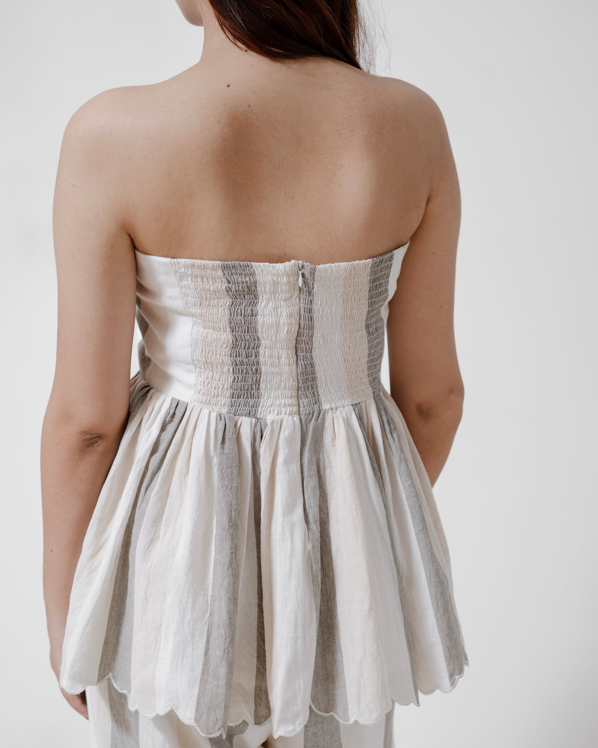 The ‘Stevi’ tube top is crafted from handspun handwoven cotton. Featuring pleats at the waist for a touch of dramatic flare, it’s finished with scalloped hems and an elasticated chain back for a comfortable, fitted look. Effortless yet striking, 'Stevi' adds playful structure to any ensemble.