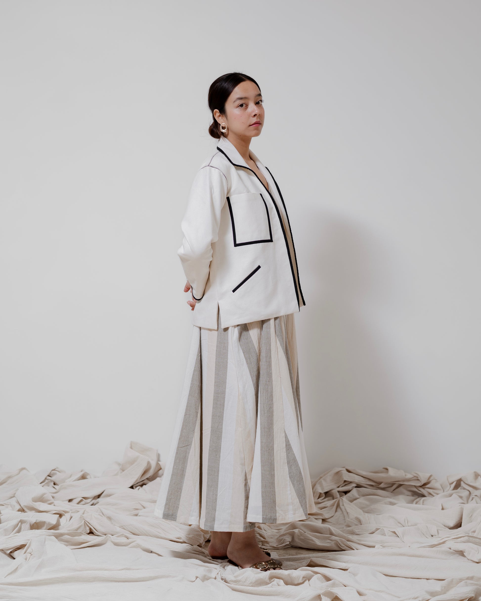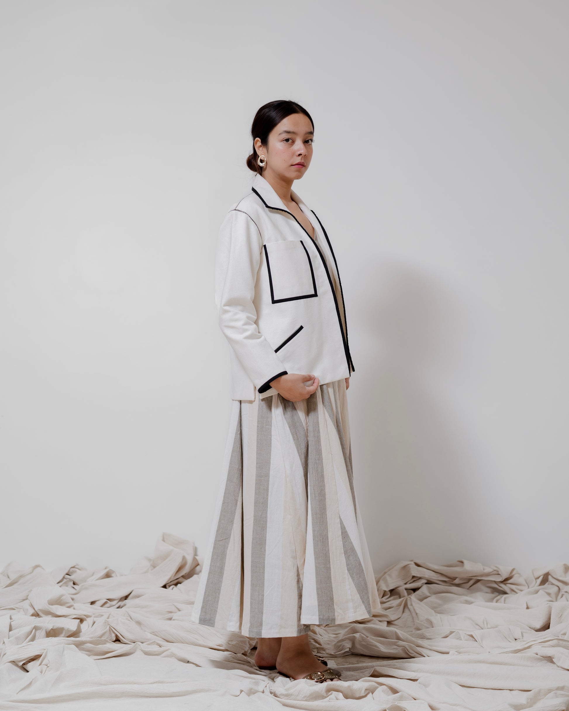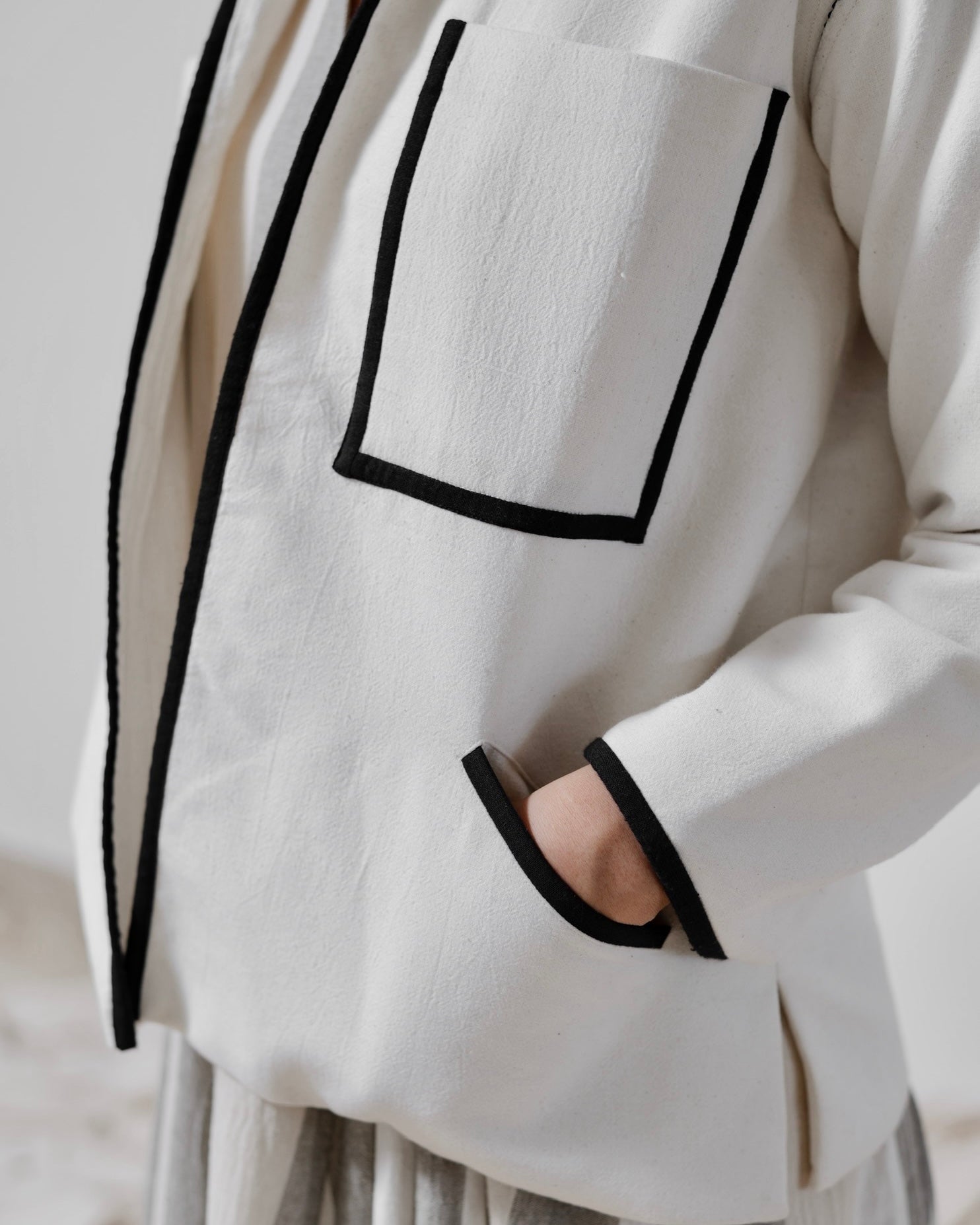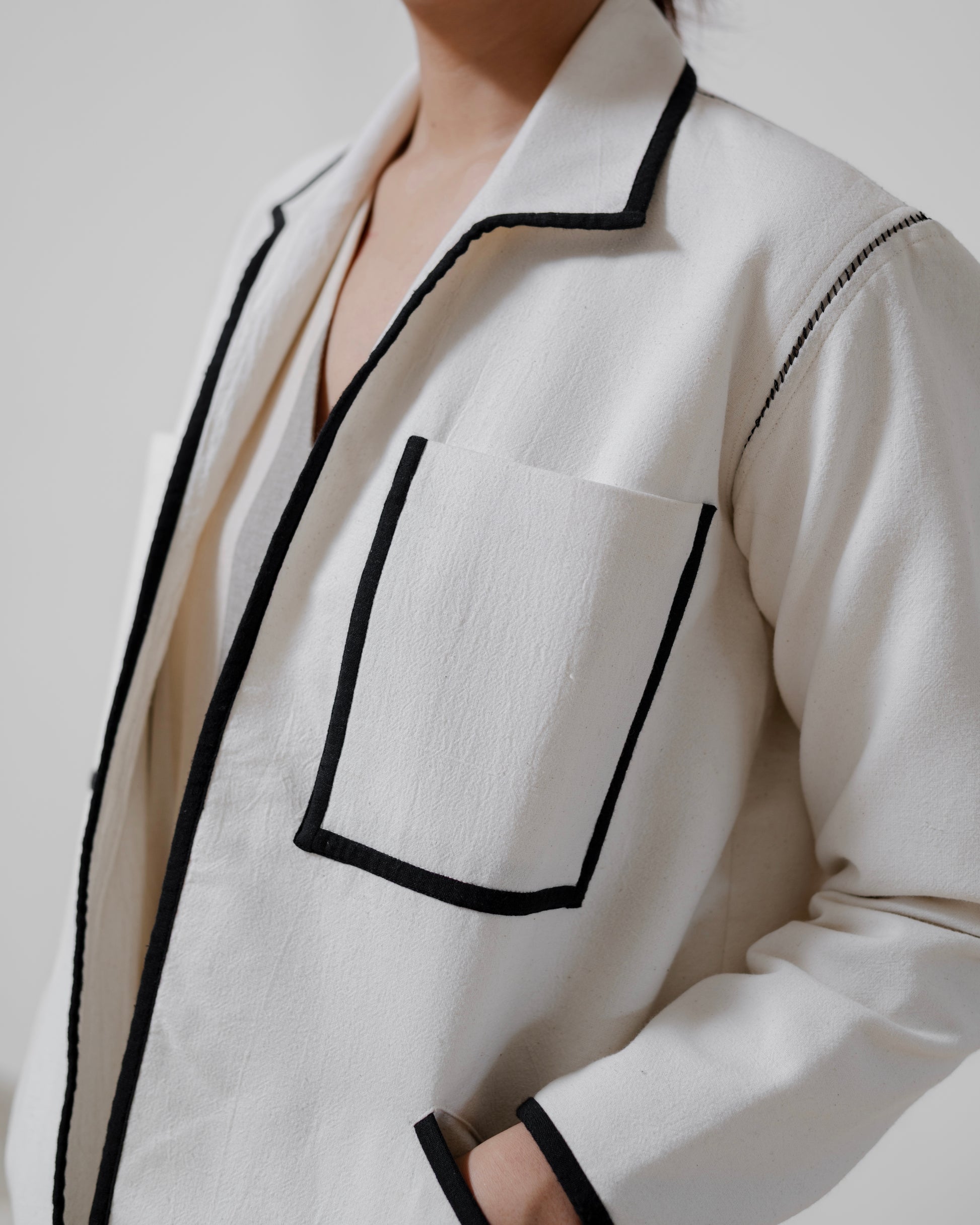 - The ‘Wealth’ coat is crafted from handwoven Kala cotton and fully lined in the same fabric for a seamless, structured finish. Delicate lace detailing around the armholes adds a touch of refinement, while subtle paneling brings contrast and depth to the design. With four functional pockets and a relaxed yet refined silhouette, the Wealth is perfect for layering — an elegant blend of utility and understated charm.